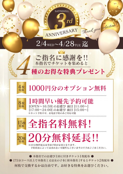 ●75分コース以上で本指名、女の子を初指名頂いた場合はチケット2枚配布